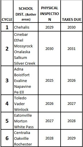 Using the chart below, for example, all property in the Adna, Boistfort, Evaline, Napavine, and the Pe Ell School Districts will be physically inspected in 2025 which provides a value for calculating taxes due in 2026.